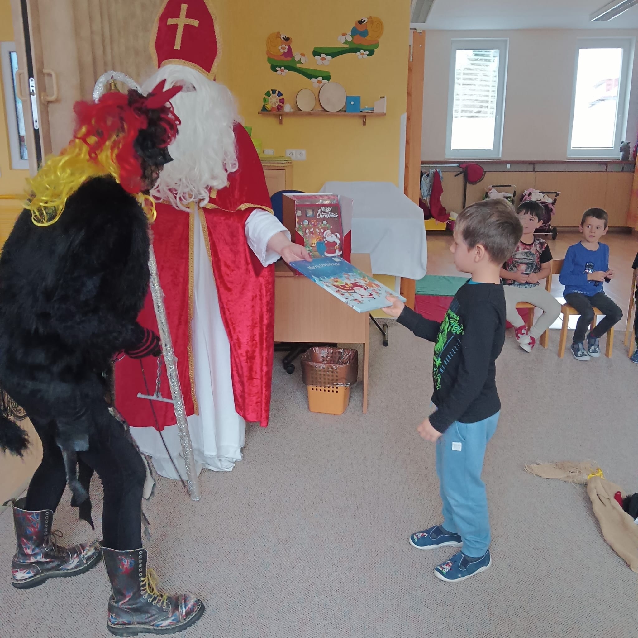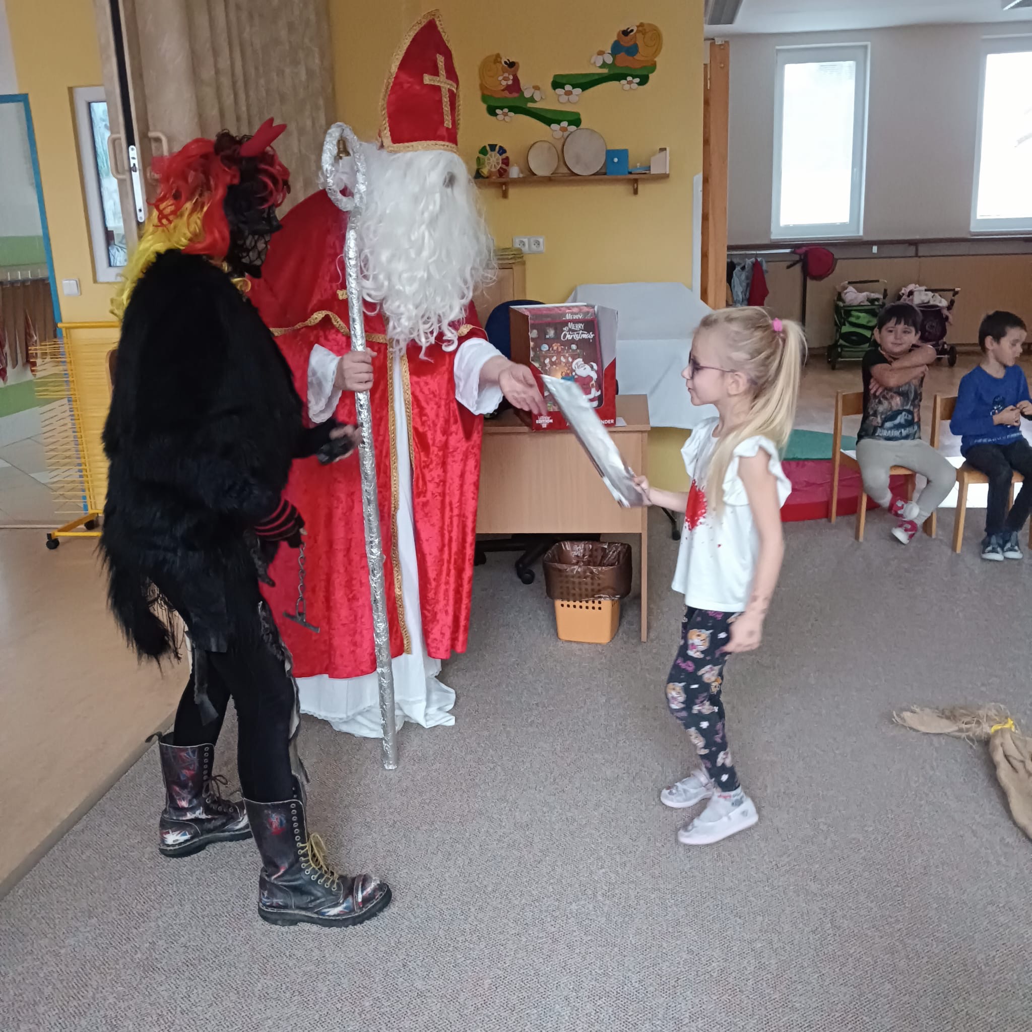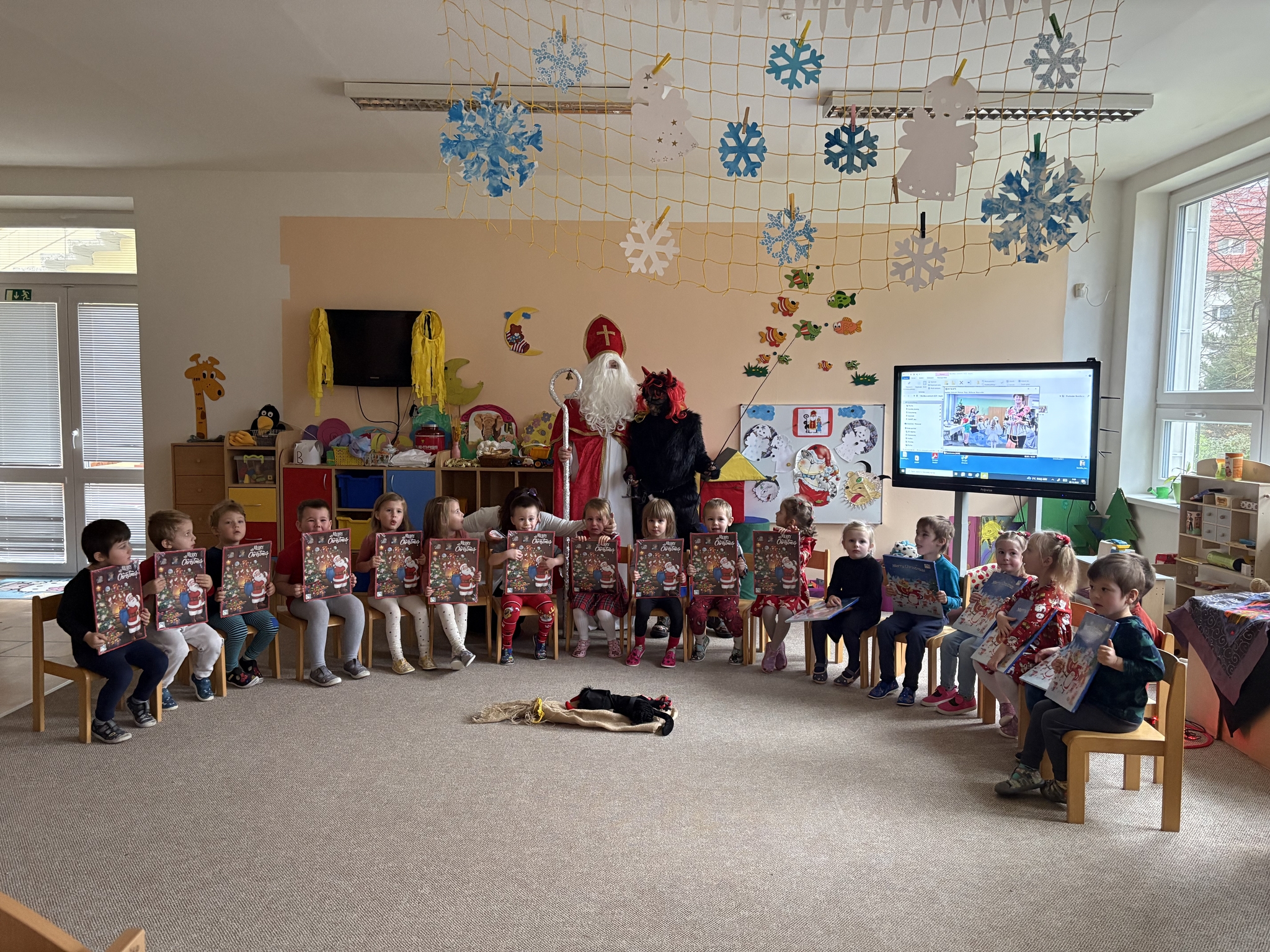 Ve středu 3.12. nás navštívil pan Mikuláš a s sebou si přivedl čerta. Děti řekly říkanku a dostaly adventní kalendář za odměnu. Pak jsme se společně vyfotili.
